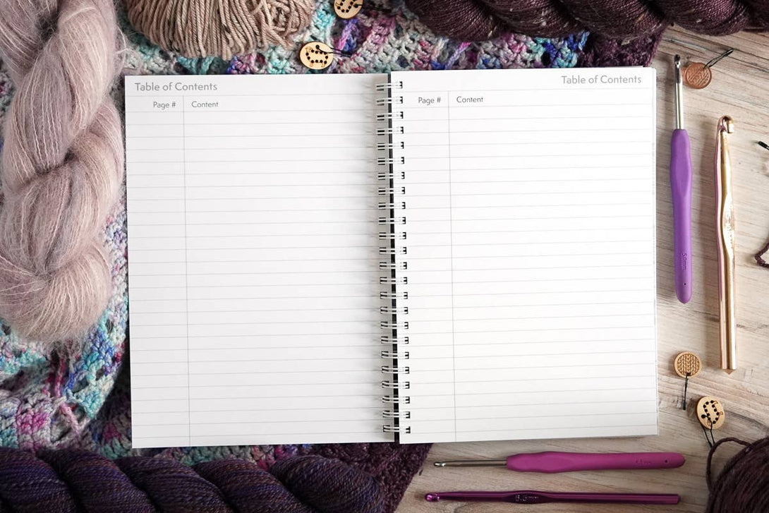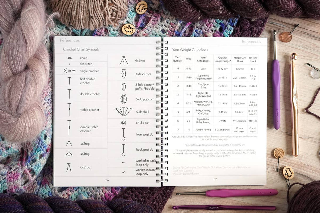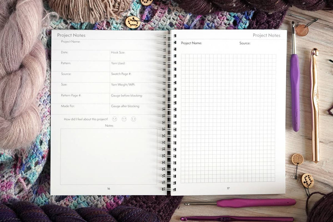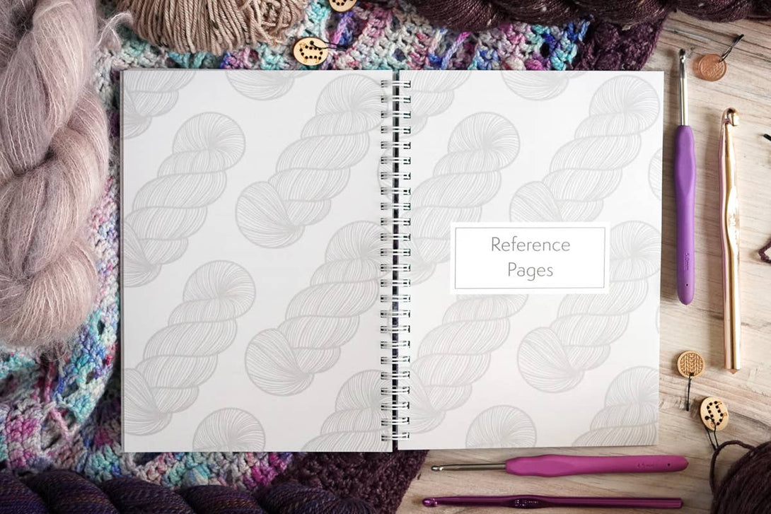 This A5 wire-o bound notebook has 120 pages that includes: - Name Plate - Index - 30 Projects with Design Pages - 28 Individual Design Pages - Numbered Pages - Yarn Swatch Notes - References and Ruler - Crochet Chart Symbols - Blank Section for Additional Notes - Inner Cover Design - 80 lb paper - Sized 5.8 inches wide and 8.3 inches tall (A5) - Proudly designed and printed in the USA